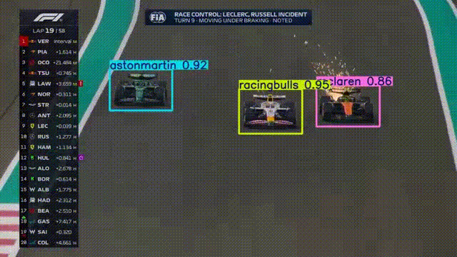 En este proyecto se implementó un modelo de detección de objetos entrenado con imágenes de monoplazas de F1, utilizando la arquitectura YOLOv8. El modelo fue entrenado con un dataset de imágenes de monoplazas de F1 temporada 2025, y fue capaz de detectar los equipos de F1 con un alto grado de precisión.